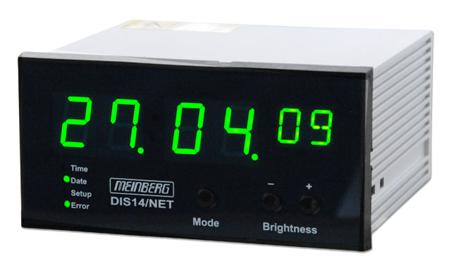 12 numeric LED digits for time and date 2 alphanumeric LED digits for day of the week 14 mm / 13 mm character height (time/date) DIS14 6-digit numeric/alphanumeric LED display for time, date, day-of-week and error code Digit height: 20 / 13 mm ANZ14, DIS14 variable brightness Modulation indicated by LEDs Setup menu for configuration Free running indicated by LED when switching to operation as a free running quartz clock |