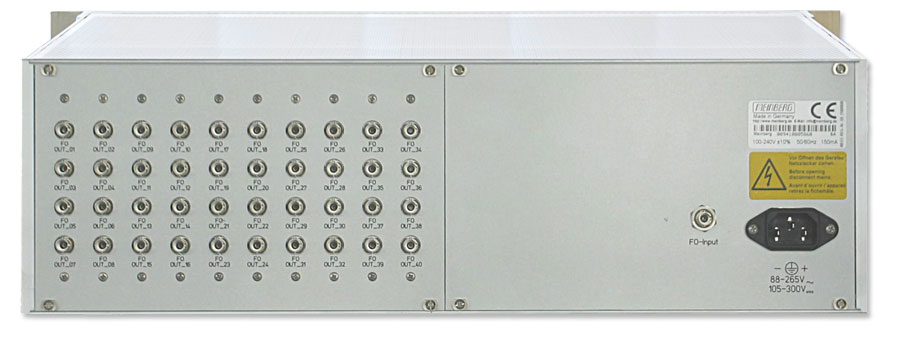 | Optical Outputs | 40 x 850nm FO output, ST connectors for GI 50/125µm or GI 62,5/125µm gradient fibre Transmission speed: up to 100 kHz Launchable optical output power: typ. 15µW per output (into GI 62,5/125µm) |