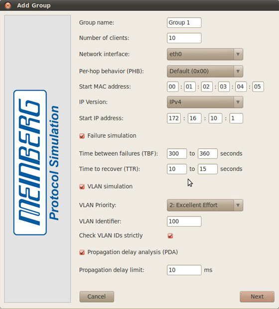 This dialog shows the general parameter configuration, which has to be set up for every simulated group. Here, the physical interface and the IP version can be selected, and the simulated MAC and IP address and special features like failure simulation, VLAN simulation and propagation delay analysis can be configured.