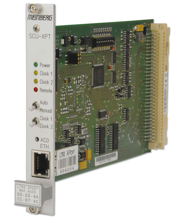 The SCU-XPT switchcard manages the automatic switchover from one GPS clock to the other in redundant systems. If clock 1 looses synchronization or fails, the SCU-XPT module automatically switches over to clock 2, which then will be the so-called "Master Clock" until it fails also (only in this case the system switches back to clock 1 if it restored synchronization).