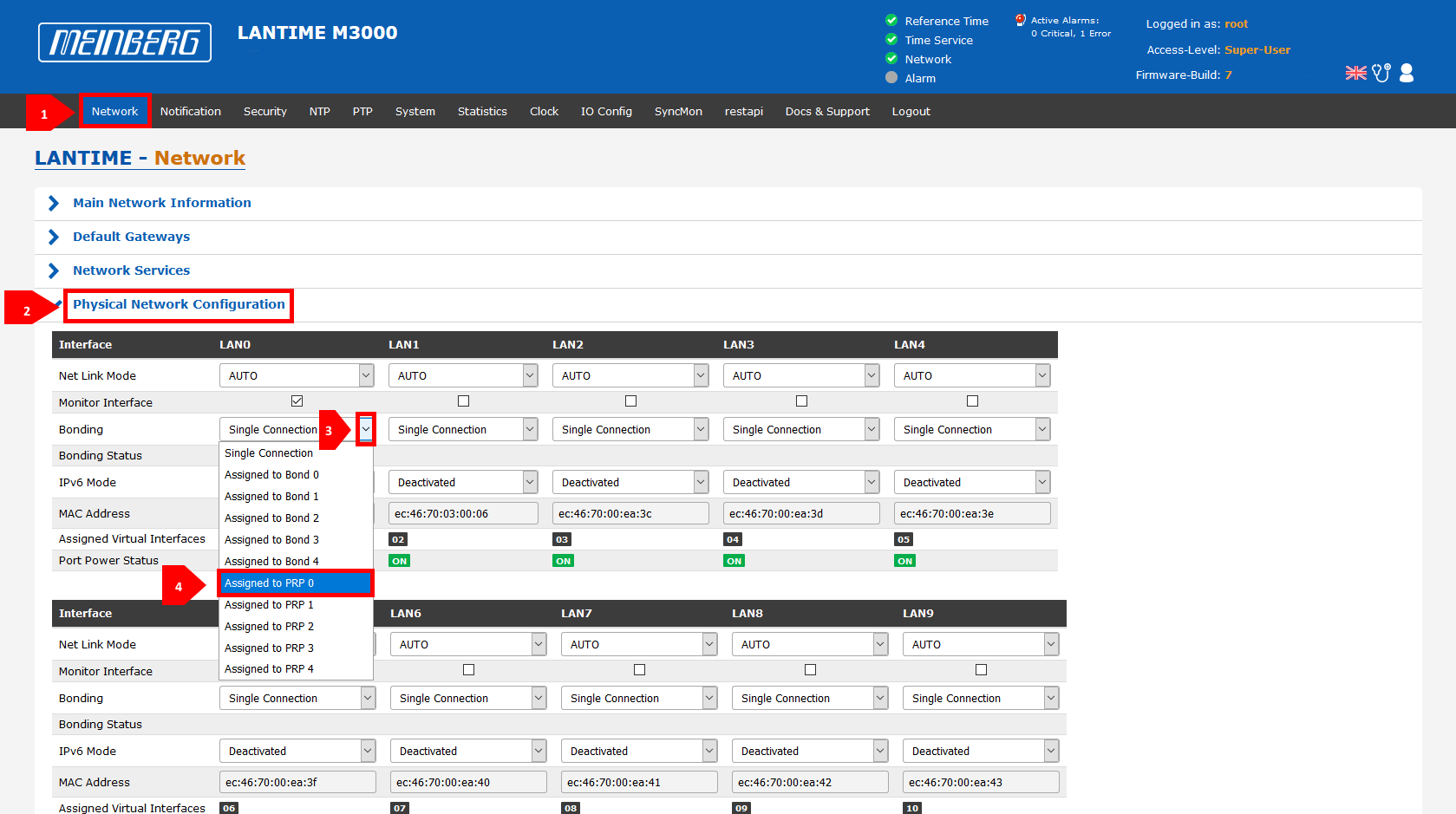 The PRP interface can be configured in the same way as it is possible in LTOS V6. Furthermore the LANTIME WebUI can also be used for that. Therefore please browse to the "Network" Chapter in the LANTIME WebUI and open the "Physical Network Configuration" Subchapter.