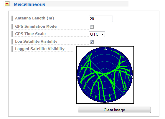 A Lantime Webinterface is another way to log and display GPS signal visiblity of an antenna. To enable it, log in to a webinterface, choose menus Receiver / Miscellaneous and check "Log Satellite Visibilty" option. "Save Settings" first and "Logged Satellite Visibility" window should appear in the menu (see Figure 6 for details).