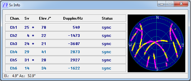 In order to sample and depict the GPS signal of your antenna, please make sure you are using v2.28 or later of the GPSMon32 software (Figure 3). The latest version can be downloaded here. Run the ".exe" file and choose "Info-> Used Sv´s" menu, right click in the graphic and select "Persistent" from a dropdown menu (click Figure 4 to enlarge). Thus, the satellite information will be ongoing updated. Yellow dots (see Figure 5) represent all captured GPS data, whereas purple is the data from which the position and time information is derived. To keep all data ongoing displayed do not close the graphical window.