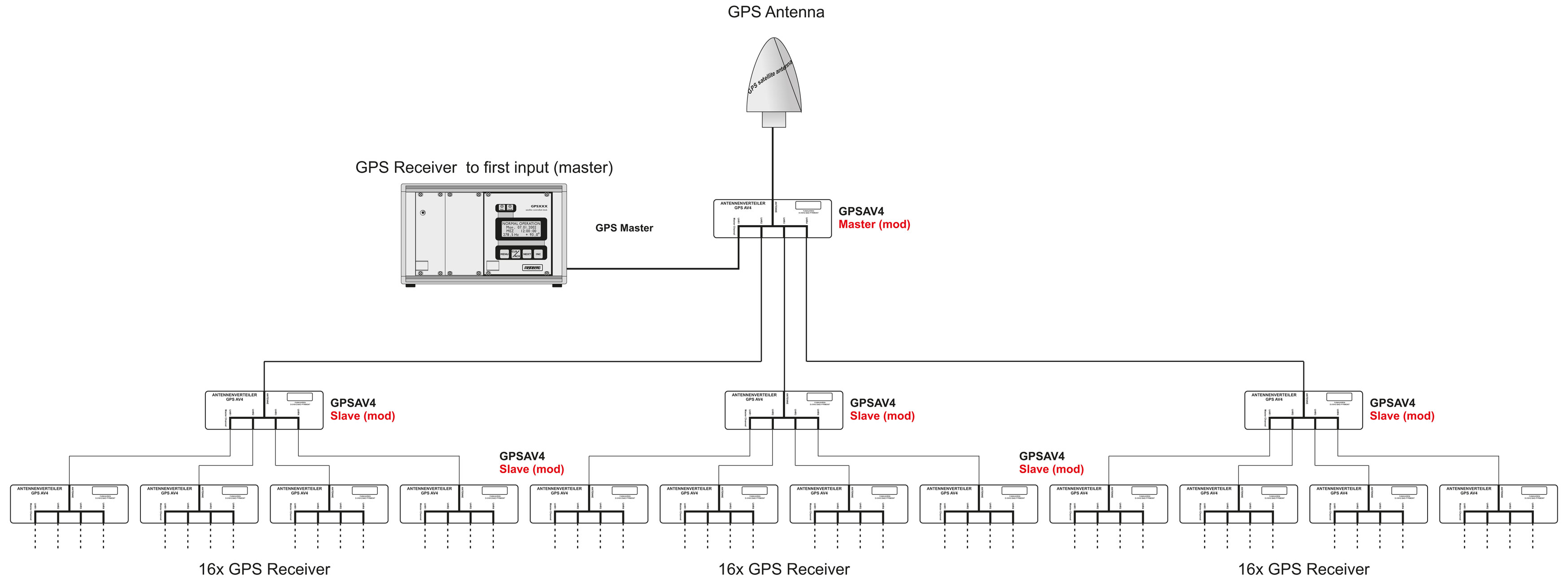 To implement the cascade, the variants GPSAV4/Master and GPSAV4/Slave must be used. The "Master" device is connected to the GPS antenna/converter unit, all other distributors have to be of type "Slave" (see Figure 3).