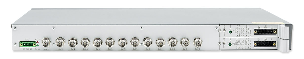 The SDU/SIN is a distribution unit, designed to provide 12x or 24x sine wave output signals with low additive phase noise (1-25 MHz) via BNC female connectors.