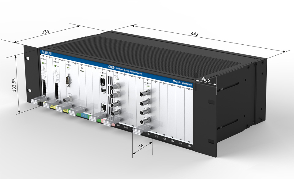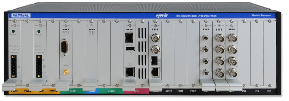 An impressive number of specialized IMS modules covers other application requirements, for example E1/T1 framed/unframed synchronization signals with full SSM/BOC support or low phase noise 10 MHz sine wave frequency outputs. Additional network interfaces for NTP, PTP/IEEE 1588, SyncE and remote management access are available, too.