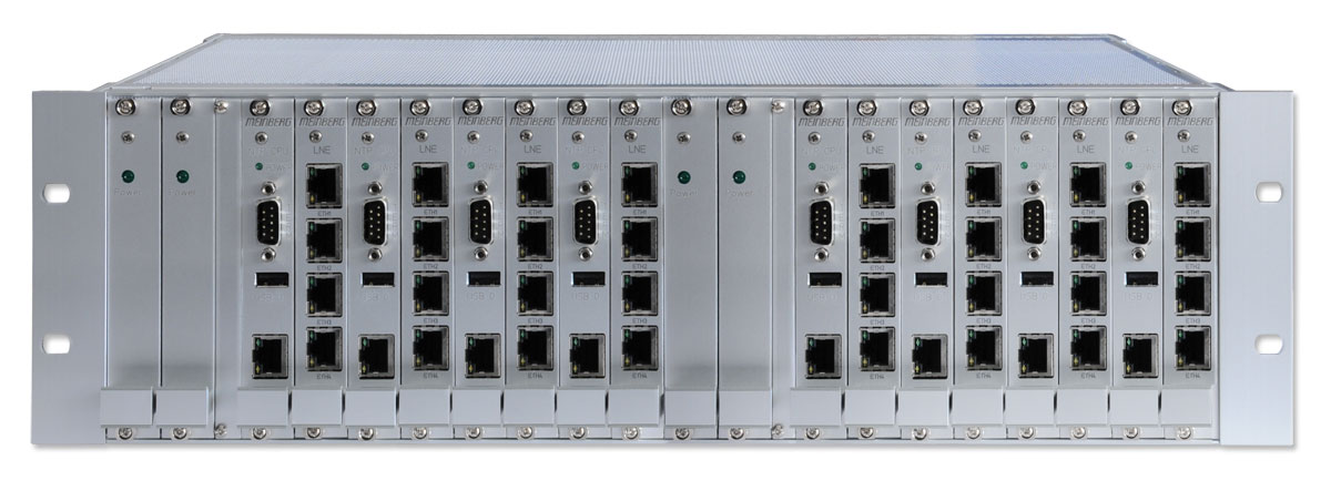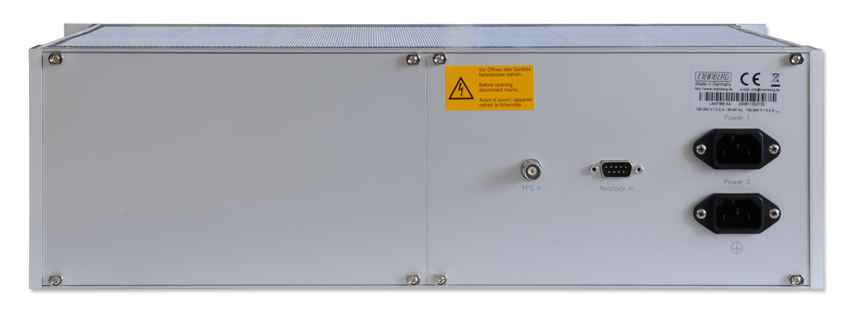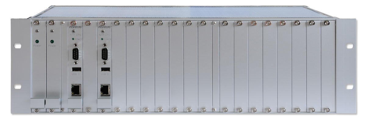 The LCES can be connected with a radio clock or a LANTIME NTP server of our M-Series (M300, M400, M600 and M900), which provides the serial time string and a PPS-signal from the reference device for the LCES system. The 3U chassis has enough space for a maximum configuration of four LAN CPUs with three LNE-4- expansions for each CPU, respectively or optionally eight CPUs with one LNE-4 expansion for each LAN-CPU.