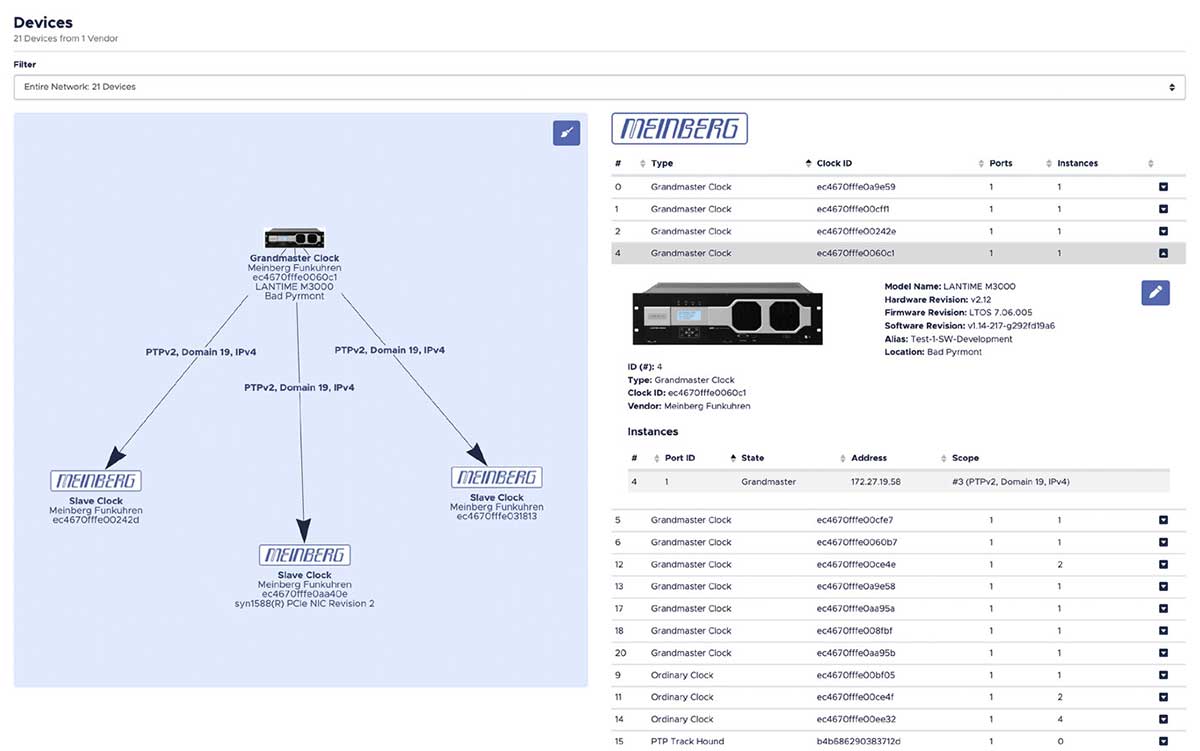 PTP Devices in the network are automatically detected and grouped into scopes for easy identification of clock relationships.