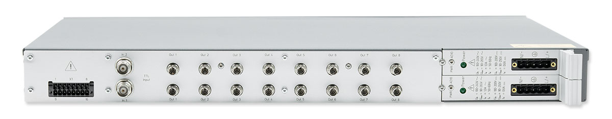 Redundant signal distribution unit with 2x TTL input and 16 x fiber optical outputs (850nm, multimode)