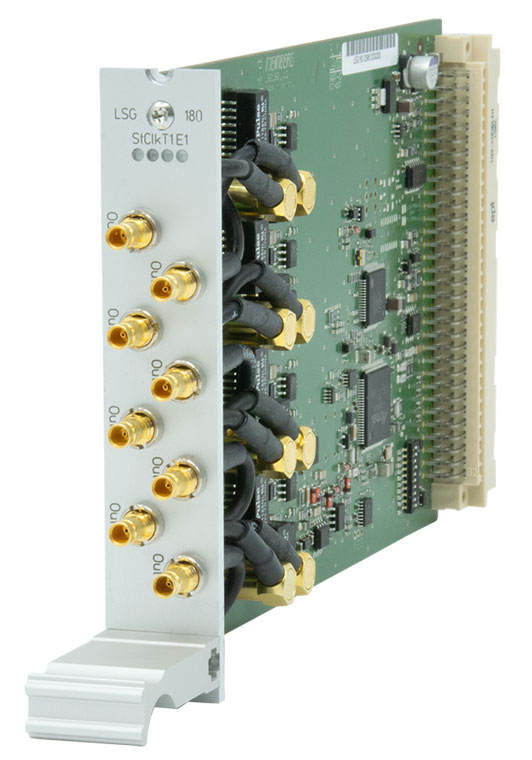 The module IMS-LSG is able to generate signals for the European E1-system and T1 - the North American digital communication operator standard.. The clock outputs are standard frequencies of 2048 kHz or 2048 kBit/s (E1) or 1544 kBit/s (T1). The E1 output signals are fully compliant with ITU-T G.703/15 (for 2048 kHz) and ITU-T G.703/11 (for 2048 kBit/s).